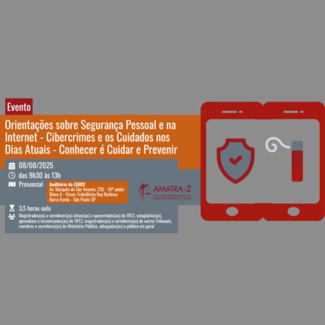 A Associação dos Magistrados de Justiça do Trabalho da Segunda Região – AMATRA-2 convida associadas/os para o evento: “Orientações sobre Segurança Pessoal e na Internet – Cibercrimes e os cuidados nos dias atuais – Conhecer é cuidar e prevenir”, que será realizado no dia 08 de agosto de 2025 (sexta-feira), das 09h15 às 13h00, no … Ler mais
