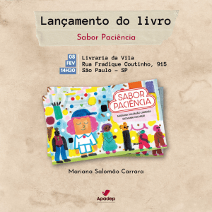 Acontece neste sábado, dia 8 de fevereiro, às 14h30, na livraria da Vila de Pinheiros, o lançamento do primeiro livro infantil da associada Mariana Carrara, Sabor Paciência. O evento contará com uma leitura dramatizada, autógrafos e sorvetinho na saída.