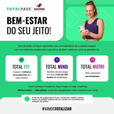 A Diretoria da Apadep anunciou na terça-feira, dia 9 de setembro, uma nova parceria com a TotalPass, plataforma multidisciplinar de atividade física e bem-estar. O convênio já está disponível para todas/os as/os associadas/os com a opção de contratação de planos individuais. E para celebrar, a Associação irá sortear 1 mês no plano mais completo da TotalPass para uma/um associada/o.