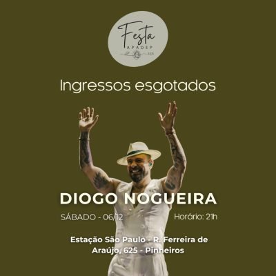 A atração principal da Festa Apadep 2025 será Diogo Nogueira, um dos maiores nomes do samba brasileiro na atualidade. Além do artista, a festa contará com banda, DJ, bar e buffet variado durante toda a noite.