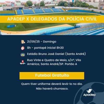Os jogos amistosos têm sido bastante animados e o time da Apadep vai enfrentar os delegados em clima de rivalidade. E ainda dá tempo de participar! Basta se inscrever pelo WhatsApp da Apadep (11) 97619-2515, com o seu nome completo e a mensagem “JOGO em Santo André”. A torcida também será bem-vinda.